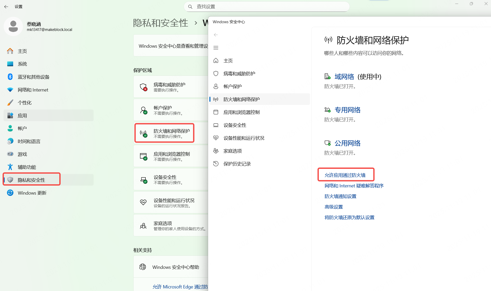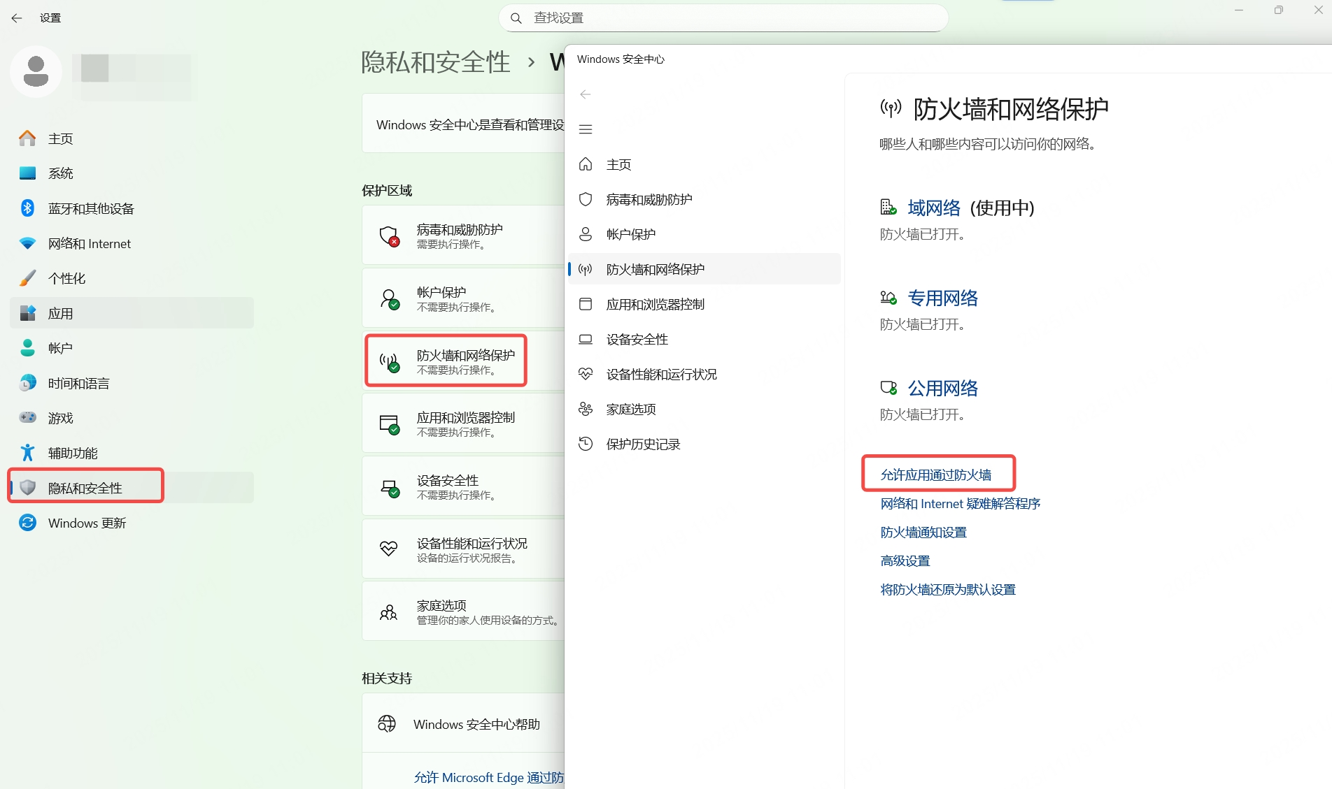 - Win 11:“控制面板”>“隐私和安全性”>“防火墙和网络保护”