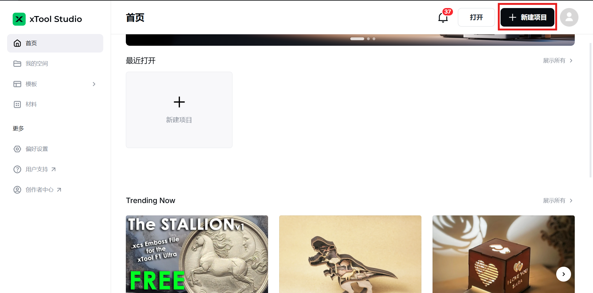 2.在电脑上打开 xTool Studio。在 xTool Studio 的右上角,单击 + 新建项目按钮。