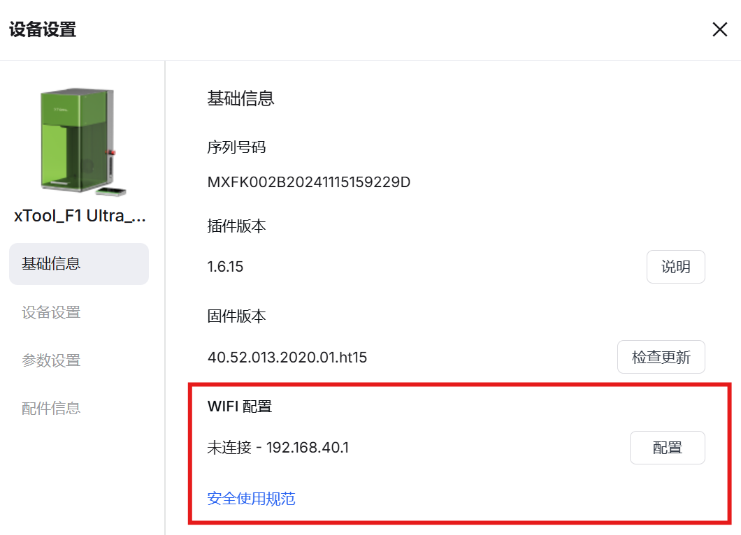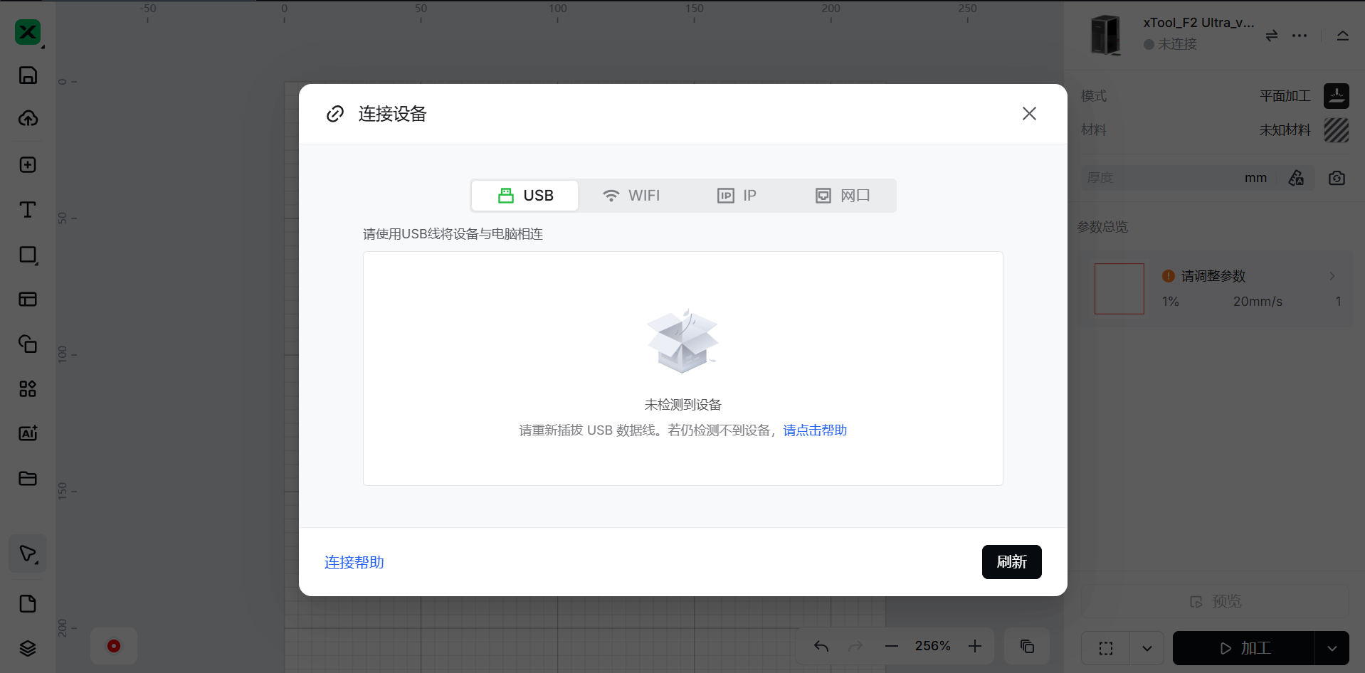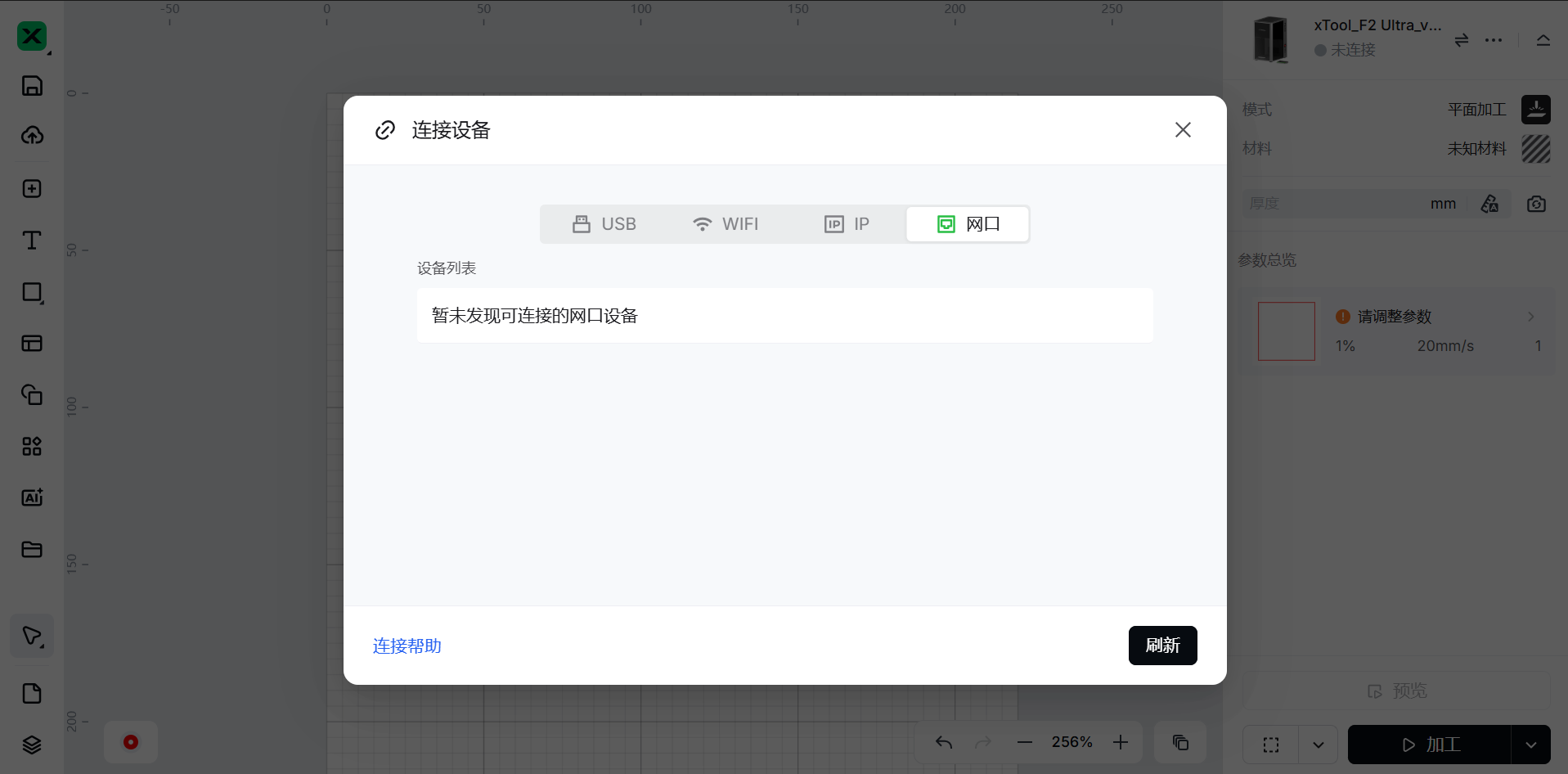 如果您想使用 WIFI 连接 Xtool 设备,您需要先使用 USB 配置 WIFI 网络并将 Xtool 连接到您的局域网。配网成功后,当电脑和设备在同一网络上时,可以进行 WIFI 连接: