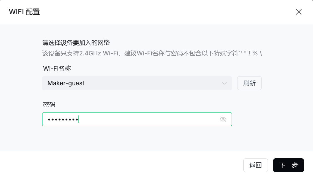 如果您的激光设备已通过 Wi-Fi 连接到电脑,您将无法配置新的 Wi-Fi 设置。要配置新设置,请先断开当前 Wi-Fi 连接并使用 USB 数据线重新连接到电脑,然后再继续进行新的 Wi-Fi 配置。