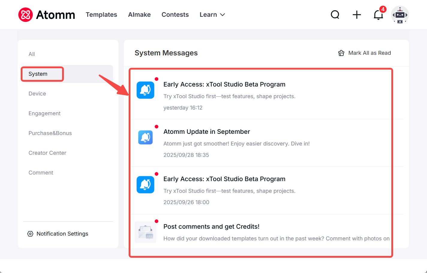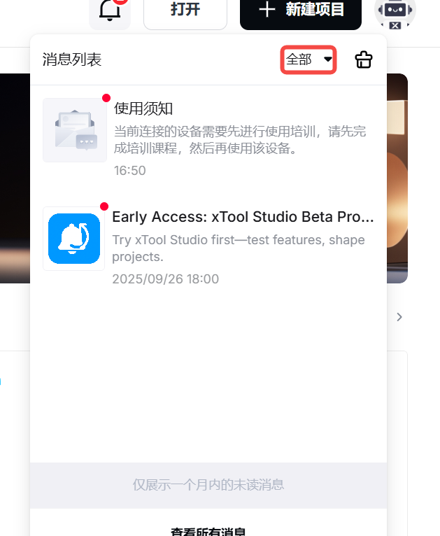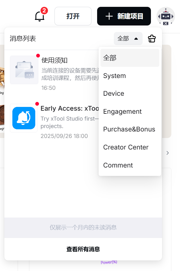应用程序消息是 xTool 软件发送给您的通知,例如订单、评论、点赞、分享或涉及您的其他交互的通知。