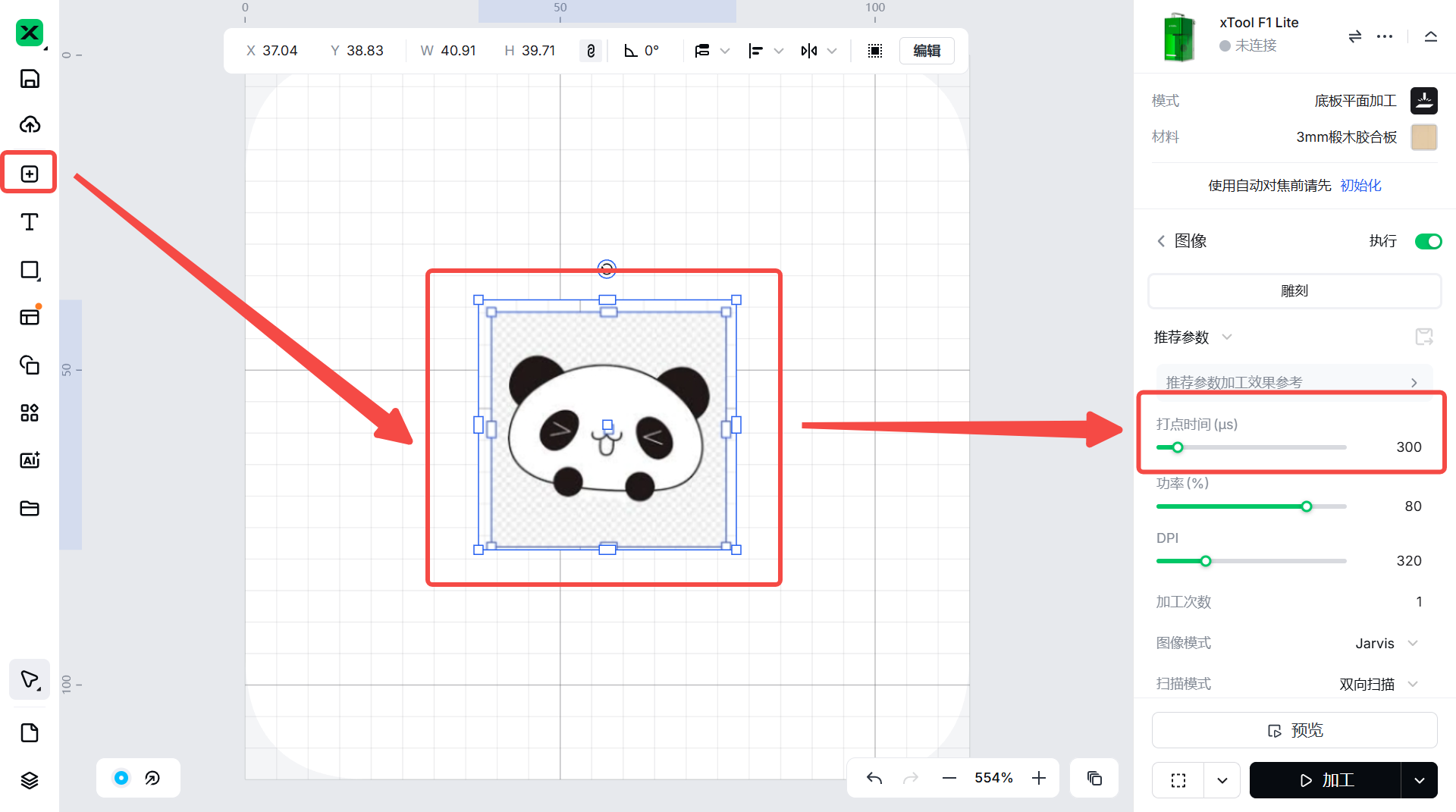 打点时间功能仅适用于使用F系列激光雕刻机的位图雕刻.