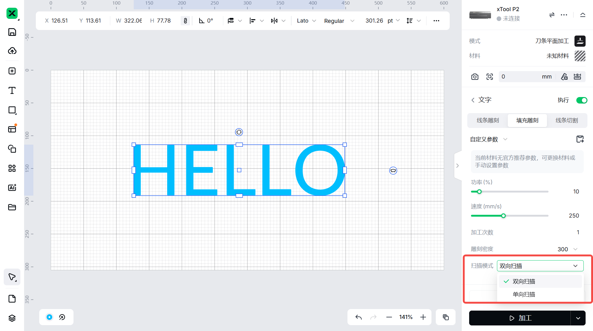 扫描模式是 xTool Studio 中的一个参数,用于设置位图和矢量路径的雕刻方式。它决定激光在雕刻过程中是使用双向扫描模式还是单向扫描模式。