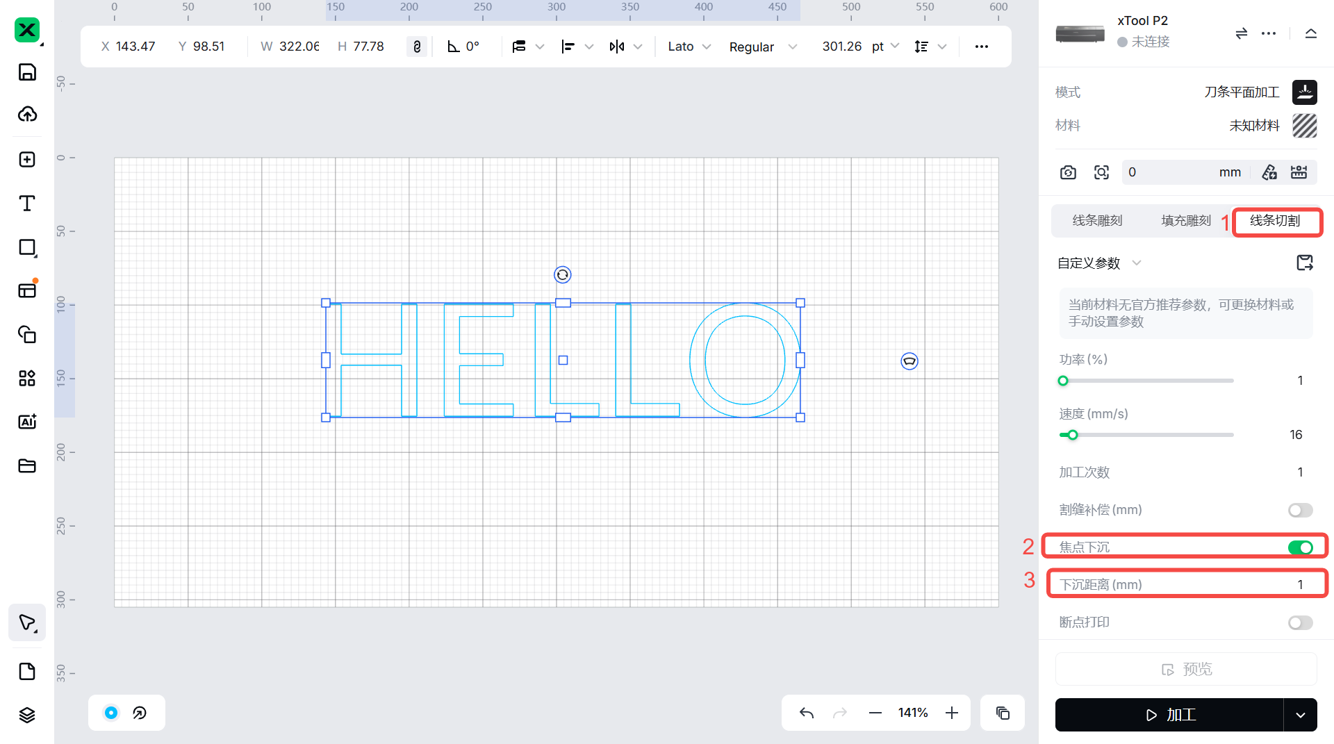 您可以启用此功能来切割厚材料,以确保更好的切割性能。启用焦点下沉后 ,您可以设置焦点降低的距离。