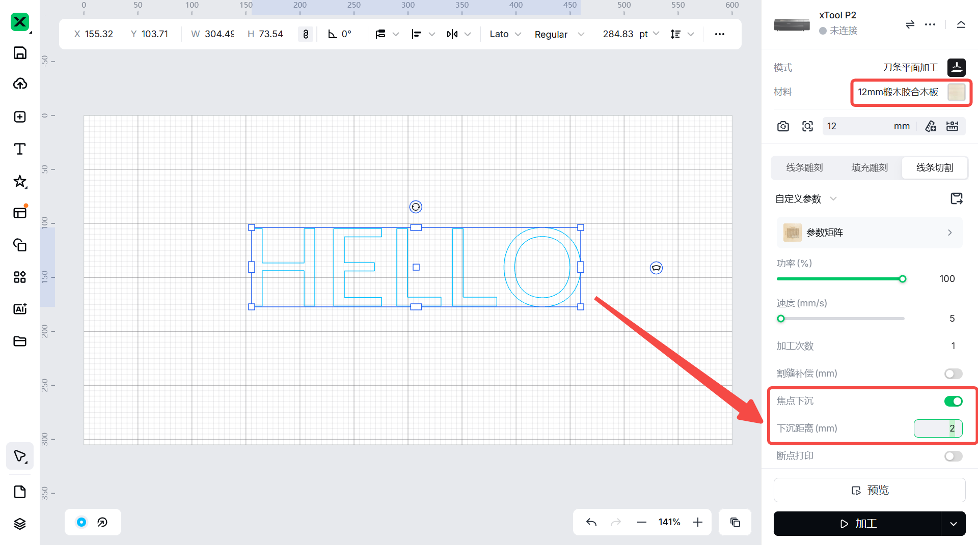 使用 xTool P2 切割 12 毫米的椴木胶合板时,您可以将焦点降低 2 毫米。