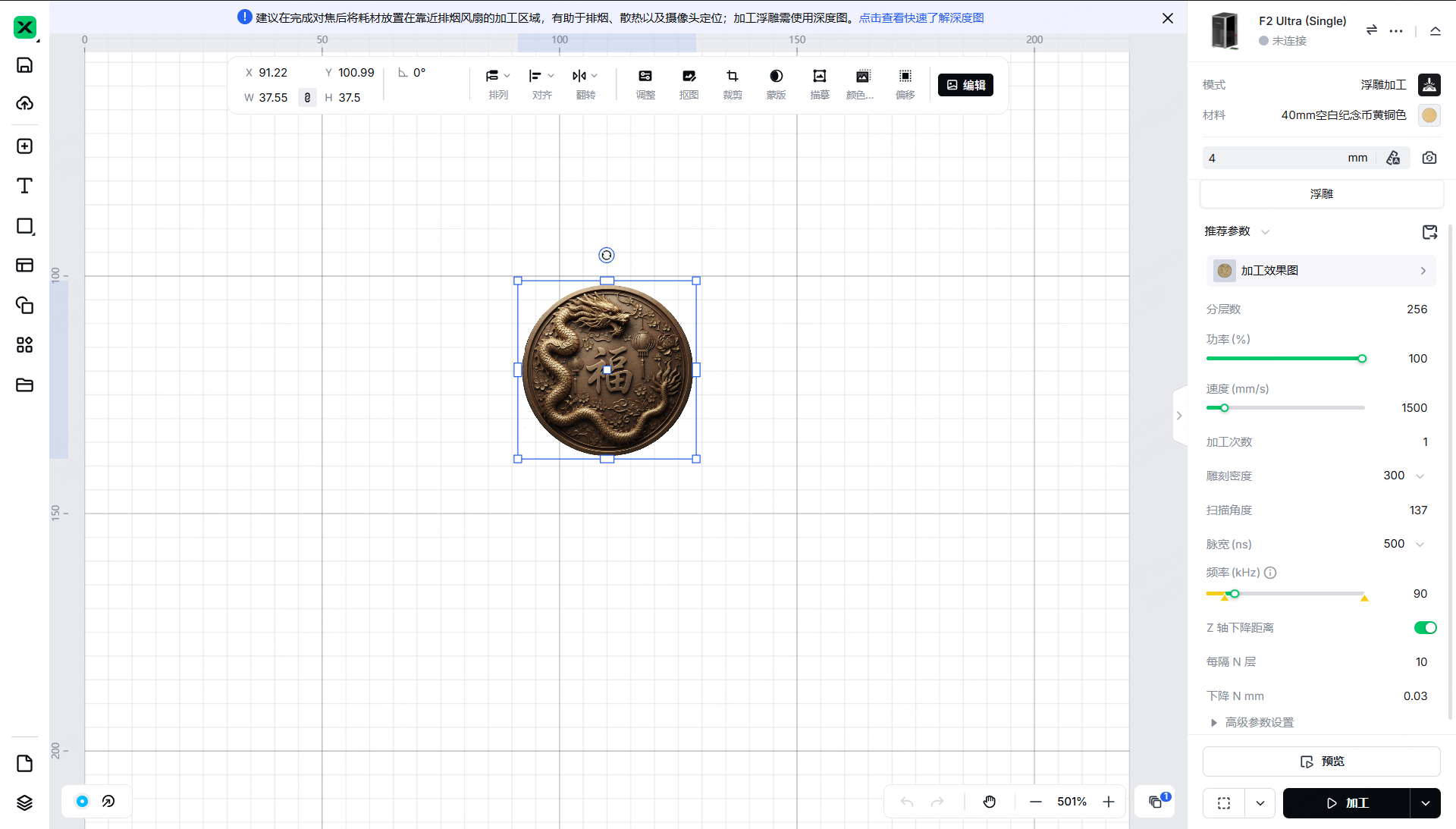 如果分层数设置为较低值(如 64 层),加工时间会缩短,但细节可能不如 256 层丰富。建议新用户从简单图案测试开始,逐步调整参数以优化效果。