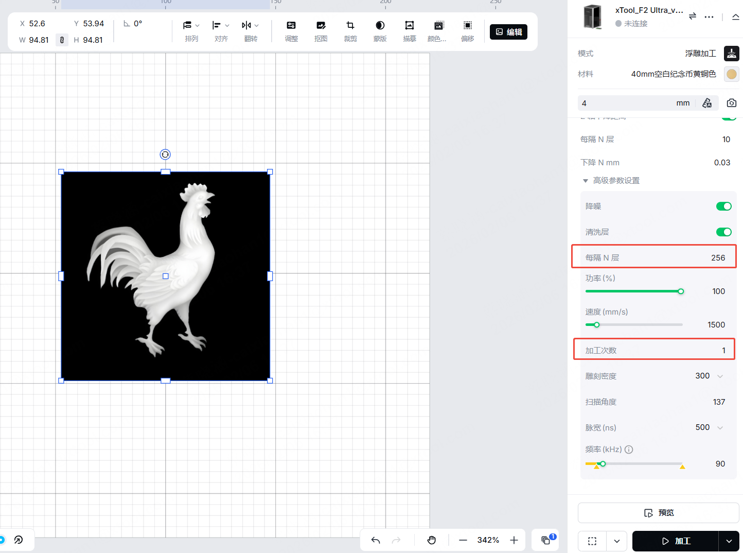 以 xTool F2 Ultra 为例,在浮雕模式下设置分层数为 256 层、加工次数为 3 次: