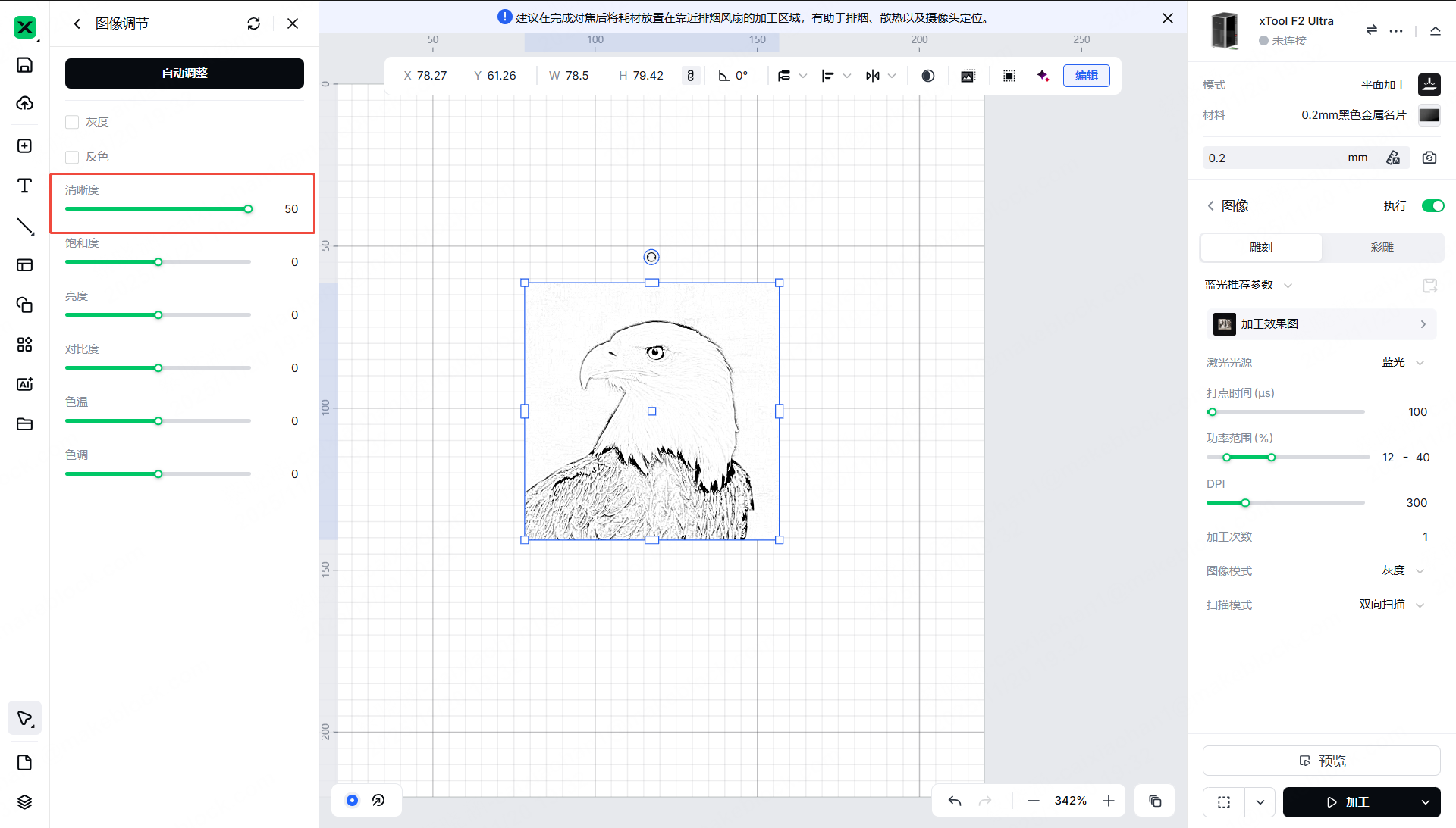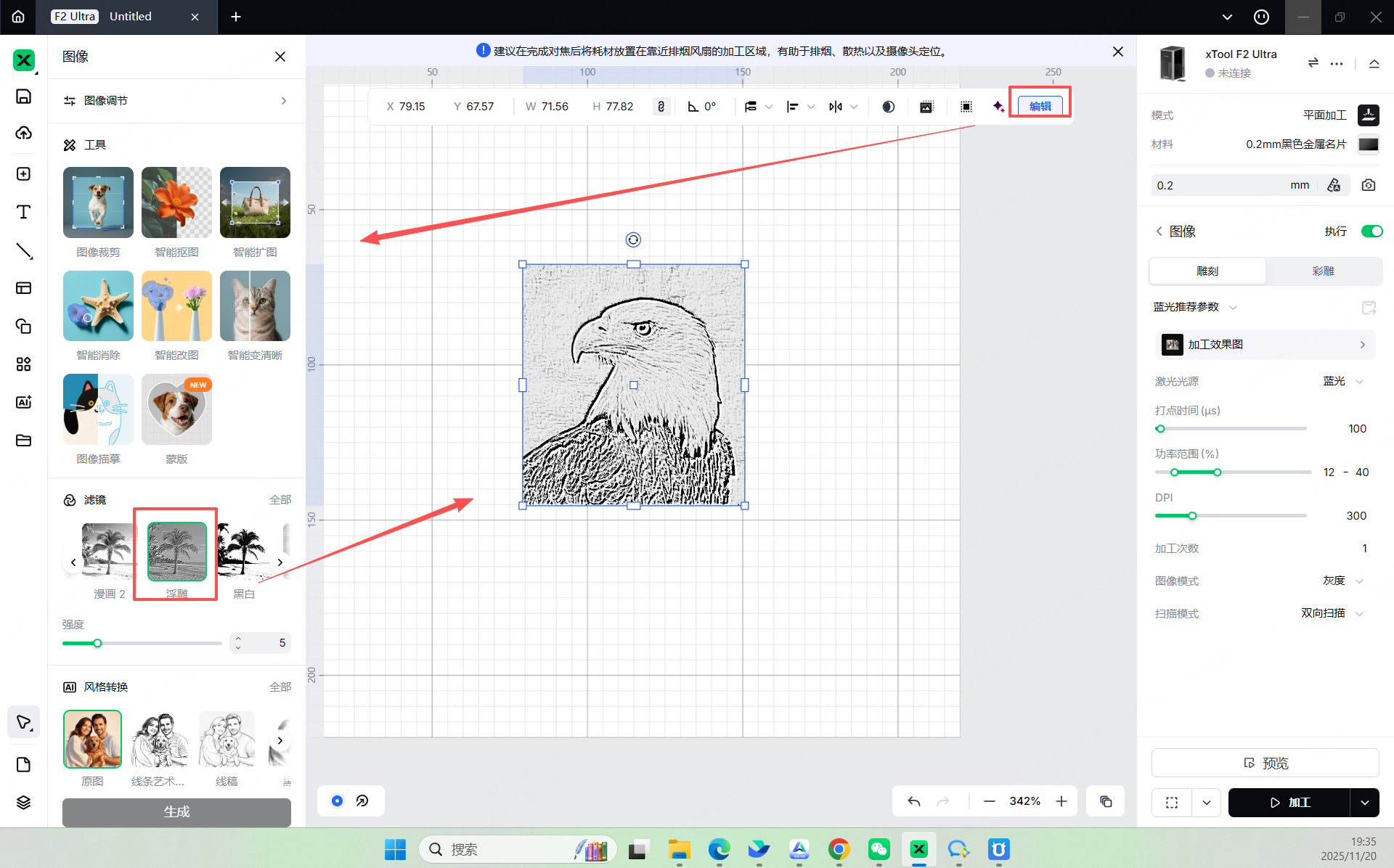 xTool Studio提供了以下选项:原图、网格化、素描、漫画1、漫画2、浮雕、黑白、半调。对于浮雕滤镜,您可以设置强度;对于半调滤镜,您可以设置最大半径。
