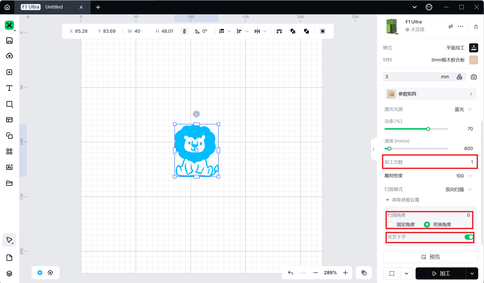 这里我们将“加工次数”设置为2次,将扫描角度调整为20度,并启用“交叉十字”。这样,激光模块第一次雕刻时会以20度的角度进行雕刻,之后三次雕刻时,每次雕刻角度都会增加20度。每次雕刻完成后,激光模块都会旋转90度,然后再次扫描。