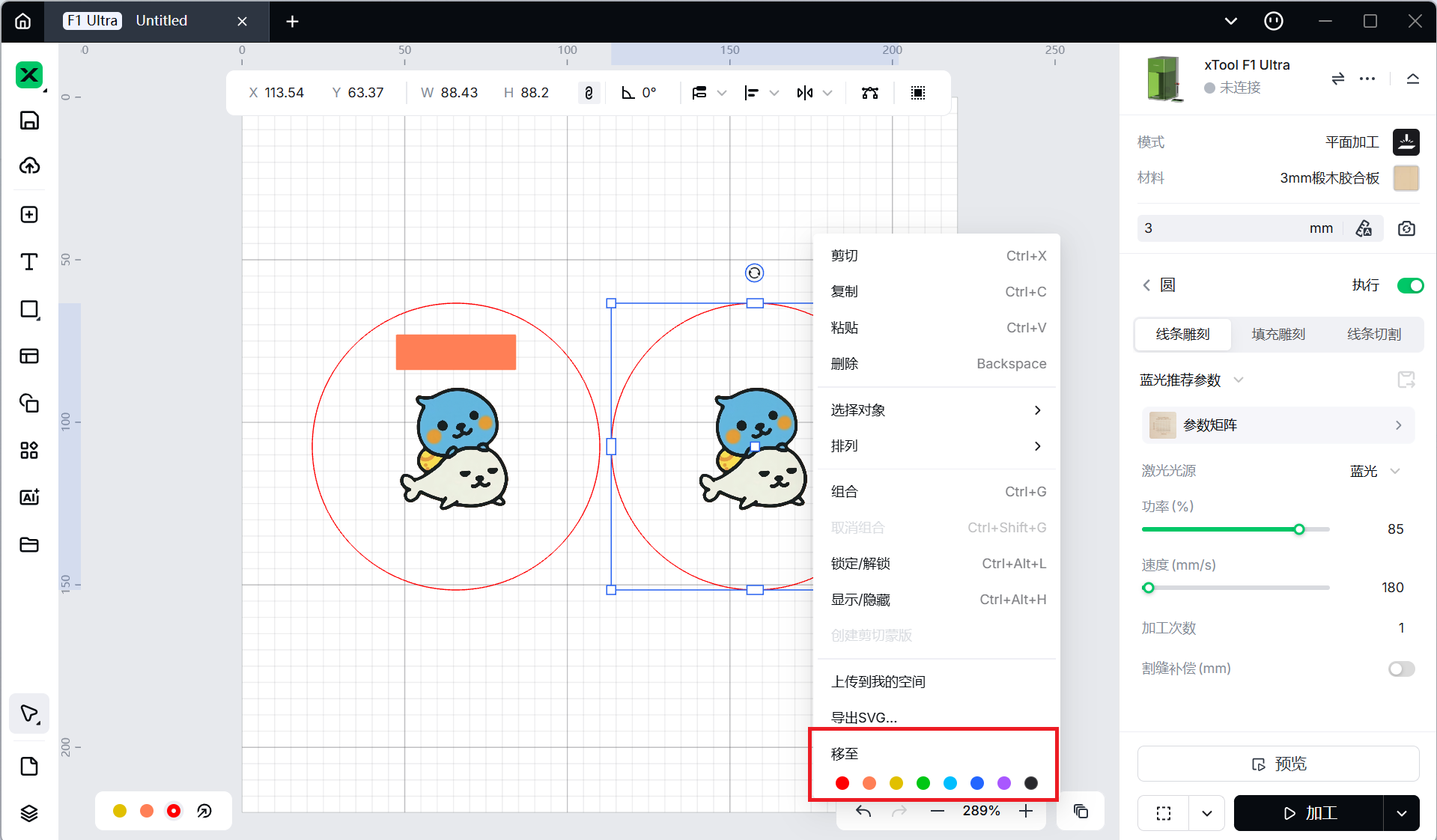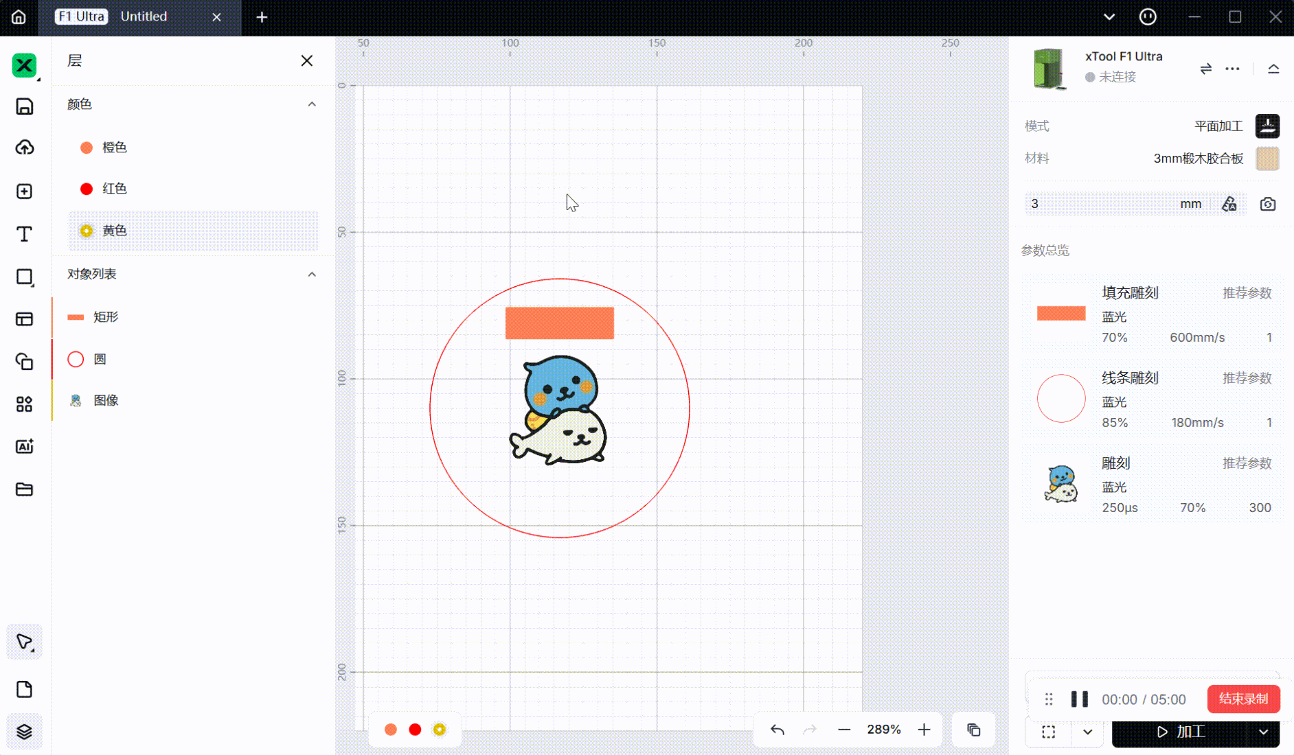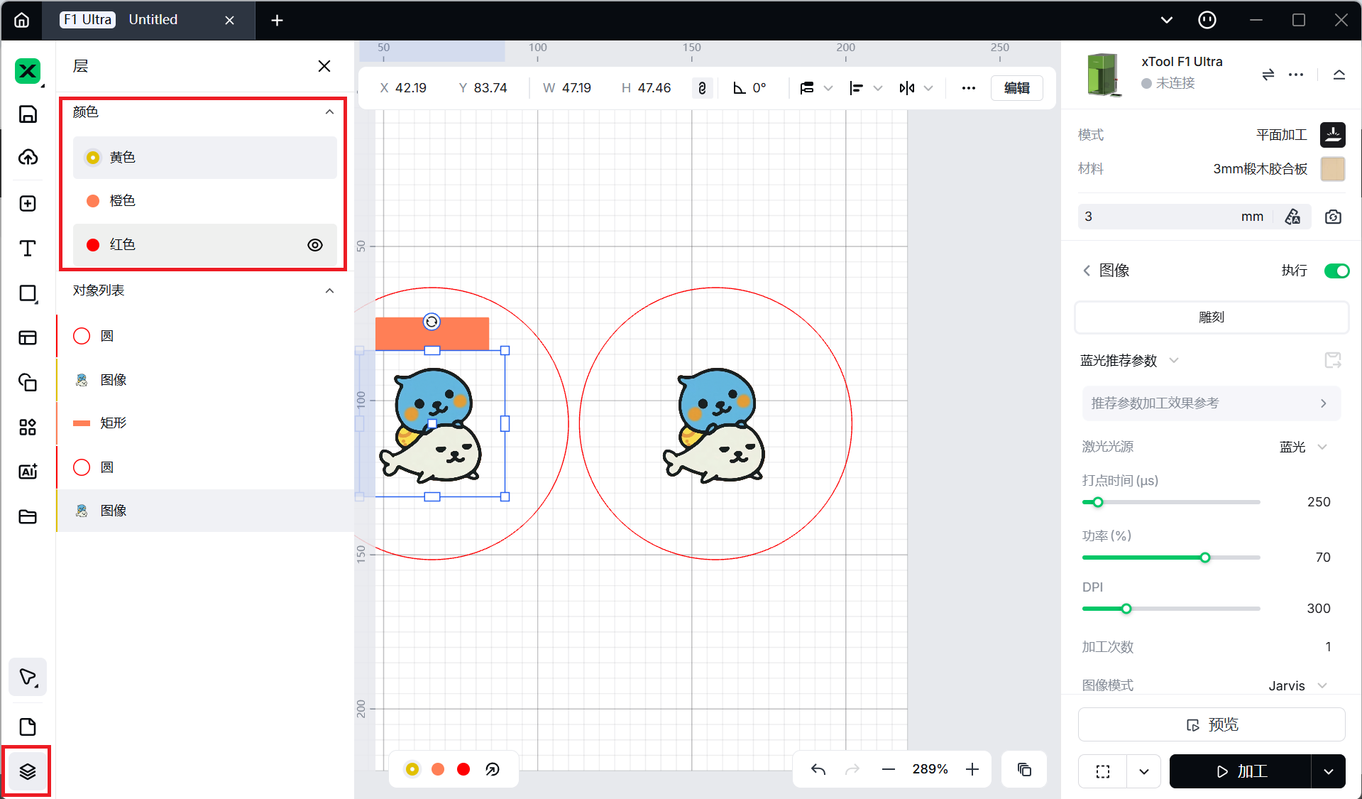 然而,xTool studio 图层并不直接设置参数。其主要目的是通过单击快速选择相同颜色的对象,然后应用统一的参数。