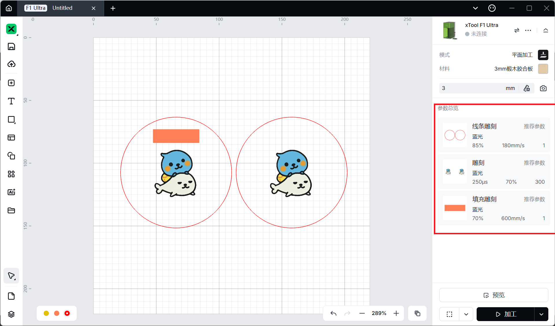 调整对象参数。选择要雕刻、刻划或切割的对象。当您选择 xTool 材料时,xTool studio 将自动为您推荐参数,无需调整。
