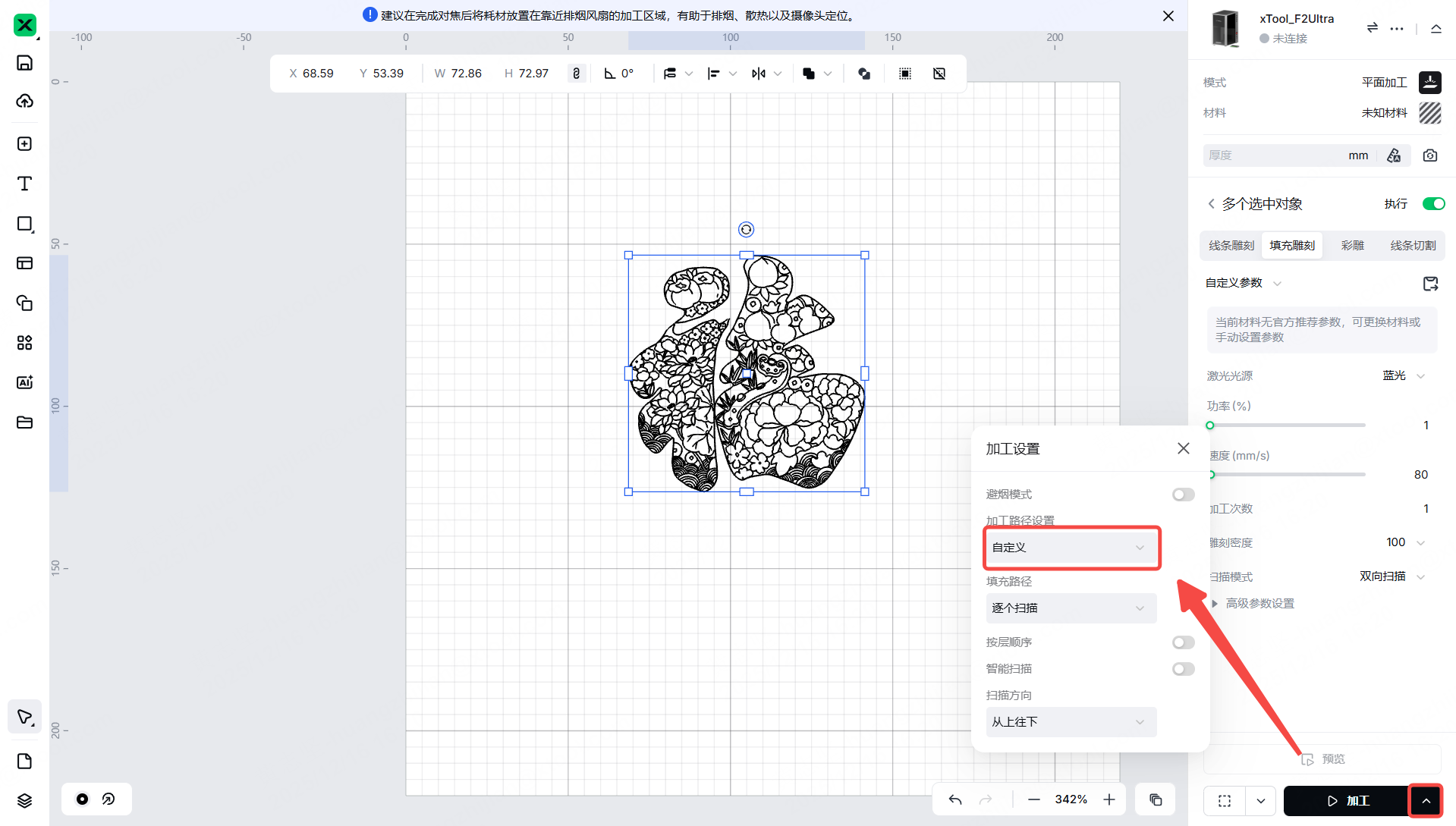 然而,xTool studio图层并不直接设定参数,其主要目的是为了方便用户通过单击快速选择相同颜色的对象,然后应用统一的参数。