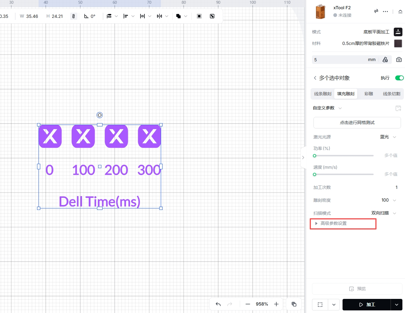 - 停顿时间 停顿时间是指在矢量填充处理期间,每完成一条扫描线后的短暂延迟。此处的停留时间使激光和材料能够散热,有助于减少热量积聚,从而获得更均匀的加工效果。